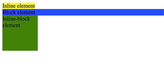 <!DOCTYPE html> <html> <head> <style> .inline-element { display: inline; background-color: yellow; } .block-element { display: block; background-color: blue; } .inline-block-element { display: inline-block; background-color: green; width: 100px; height: 100px; } </style> </head> <body> <span class="inline-element">Inline element</span> <div class="block-element">Block element</div> <div class="inline-block-element">Inline-block element</div> </body> </html>